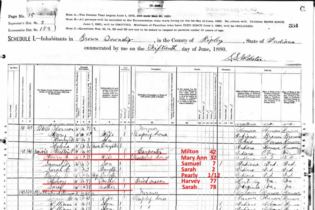 In the 1880 US Census, Milton and Mary Ann Jarvis and their children were living with Harvey and Sarah on the 40 acre farm in Ripley County. Harvey and Sarah were in their late 70s, so they probably required some care from Mary Ann.