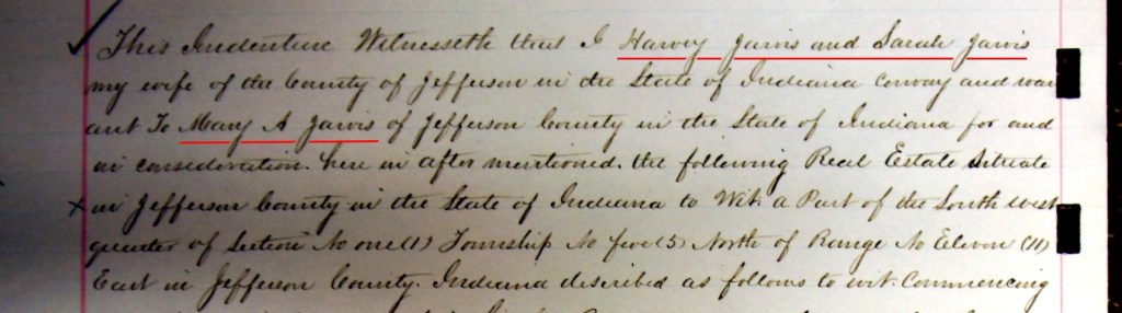 - Deed – Harvey and Sarah Jarvis to Mary A Jarvis – 1876 – Jefferson County Recorder’s Office – Madison, Indiana