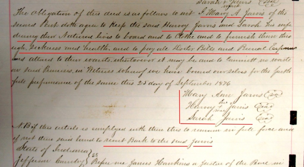 “The condition of this deed is as follows to wit: I, Mary A Jarvis of the second part doth agree to keep the said Harvey Jarvis and Sarah his wife during their Natural lives to board and to Clothe and to furnish them through sickness and health, and to pay all Doctor Bills and Burial Expenses and attend to their wants, whatever it may be and to Committ no waste on said Premises in Witness whereof we have bound ourselves for the faithful performance of the same this 25 day of September 1876.“