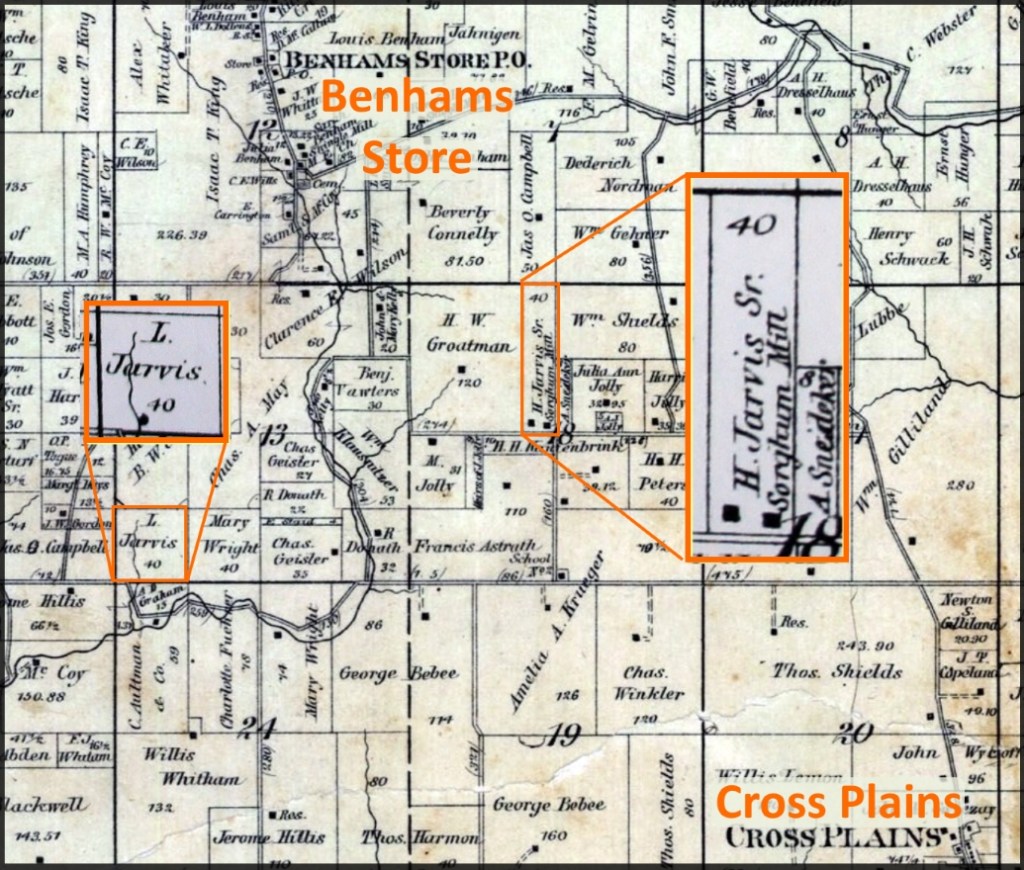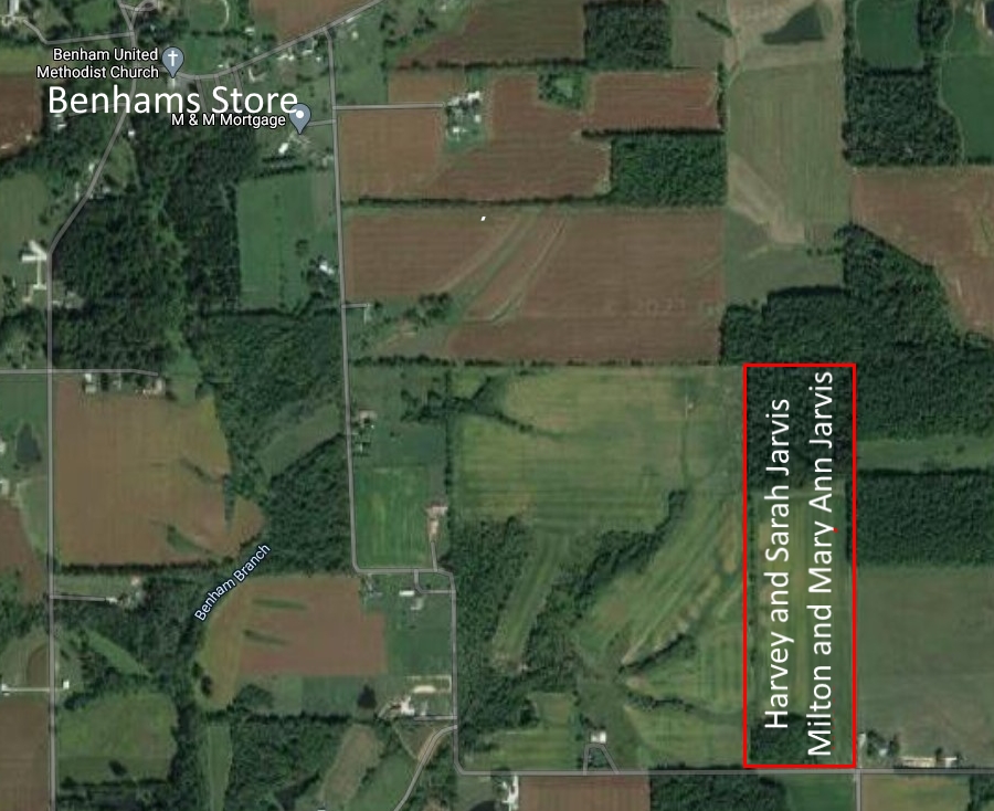 The farm is midway between Benham’s Store and Cross Plains. Notice that Lafayette and Rebecca Jarvis moved too. Their farm is two miles west of Harvey and Sarah’s.
