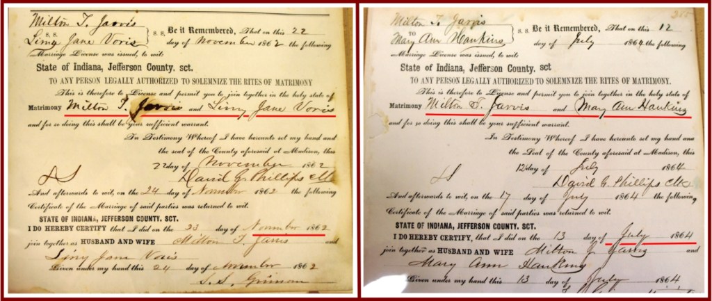 - Marriage license – Milton Jarvis and Liny Jane Voris – 1862 – Ripley County Clerk, Versailles, Indiana