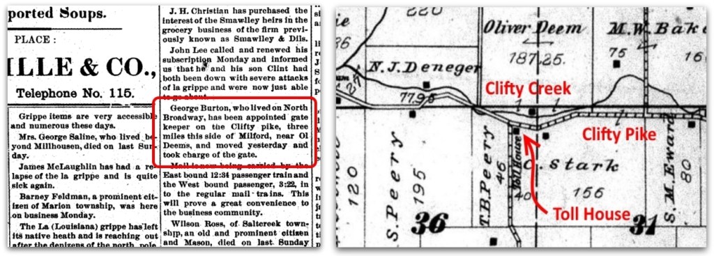 In 1892, George got appointed as the gate keeper on the Clifty Pike, a toll road. Probably less physical than a farm laborer job. After all, George was then age 57.