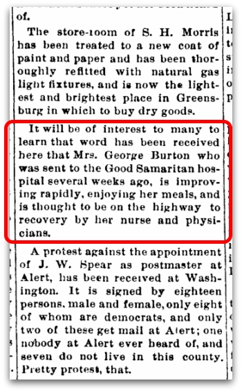 Eliza had a few bouts of poor health. In 1894, she was sent to Good Samaritan Hospital in Cincinnati. She recovered. And despite repeated bouts, she continued to live a long life in Greensburg.
