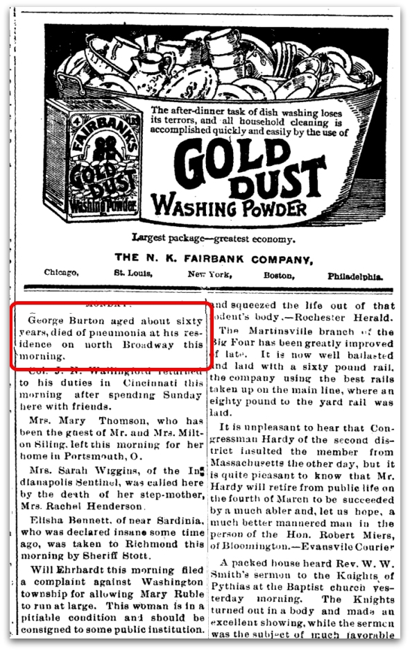 In 1865, Annabelle married George Burton’s brother Allen. So there were two Burton brothers married to two Archibald sisters. I believe George and Eliza moved to Greensburg because Allen and Annabelle were living there. Both families settled on North Broadway, just a few houses apart.