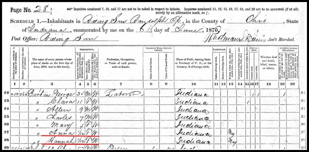 The census lists Anna and Hannah Burton, born May 15. But there was a mistake, as we’ll see. There were also three older children – Allen, 9, Charles, 7, and Mary, 4.