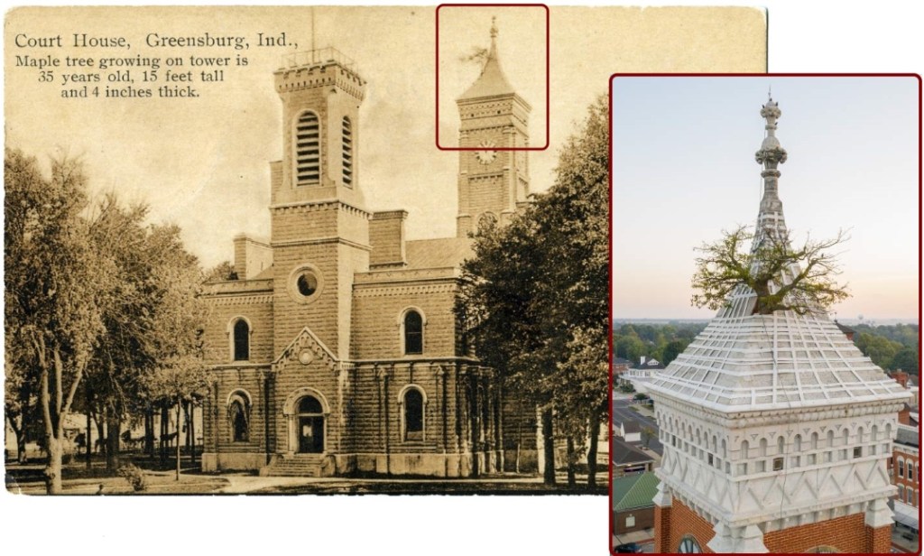 Greensburg was famous then, as it is now, for the tree growing from the Decatur County Courthouse roof. There have been several subsequent trees since the 1890s, but a tree has always been growing there.