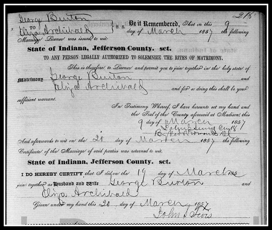 - Marriage license – George Burton and Eliza Archibald – 1857 – Jefferson County Recorder – Madison, Indiana