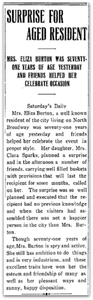 Anna’s mother Eliza Burton celebrated her 71st birthday on November 10, 1911. She was born in 1839. Eliza is our 3rd great-grandmother.