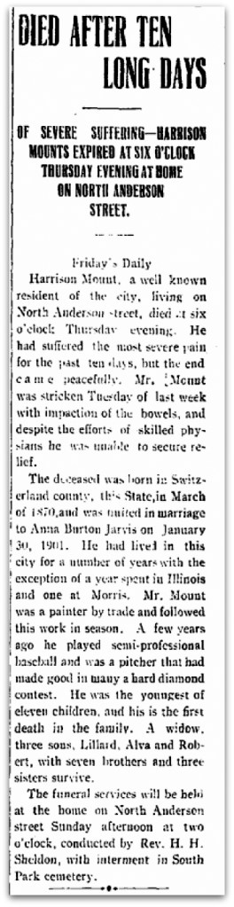Harrison Mounts died unexpectedly at 6 pm December27, 1912.