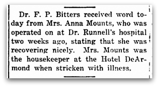In 1910, Anna Mounts’ friends had a surprise 40th birthday party for her, with baskets of a delicious supper and an afternoon of music. The ensuing years hold some big life changes. Let’s continue…