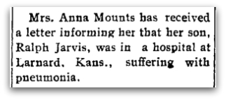 We don’t know whether our guess is correct, but Ralph had made his way to Larned, Kansas by April 1916, where he was hospitalized for pneumonia.