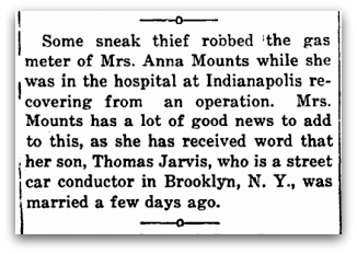 Anna’s sons from her marriage to Newton Jarvis are Ralph, 15, Elmer, 20, and Tom, 18. Ralph is living at home. Elmer’s working in Illinois, Tom in Michigan City, Indiana.