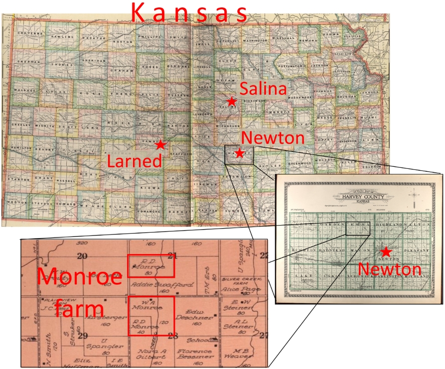 - Map composite – W.A. Monroe farm in Harvey County, Kansas – Standard Atlas of Harvey County, Kansas – Geo. A. Ogle and Co. – Chicago – 1918 – https://www.kansasmemory.org/item/223955/page/2