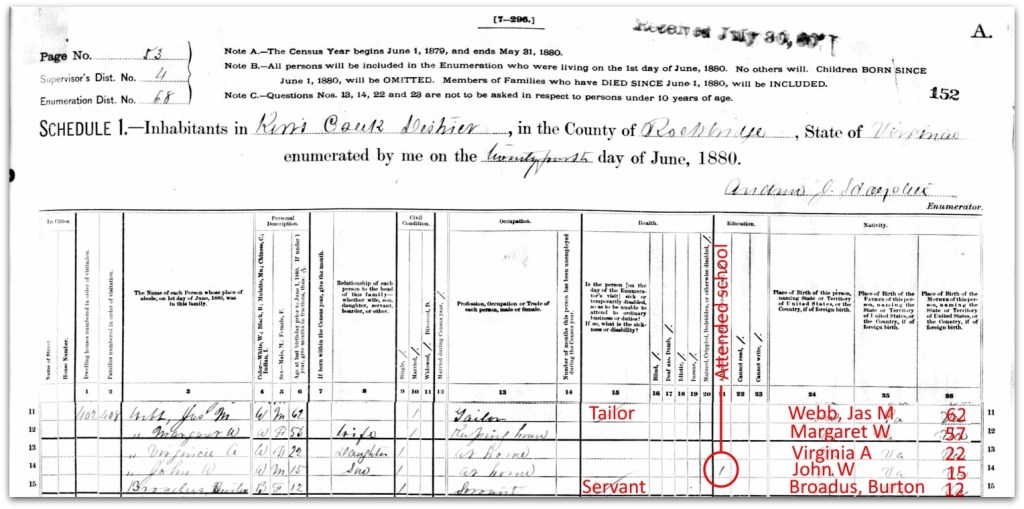 John was 16 (incorrectly listed in census as 15). John had attended school in the past year. His sister Virginia was age 22 and living at home. Burton Broadus was a 12-year-old girl living in the household. She was a servant, likely an orphaned neighbor.