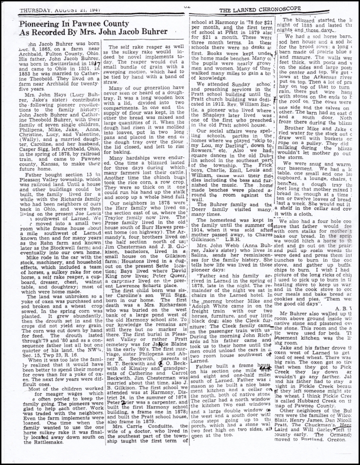 In August 1947, the Larned Chronoscope, a local newspaper, published the recollections of sisters Anna Buhrer Webb and Lucy Buhrer Hays about their early days in Pawnee County.