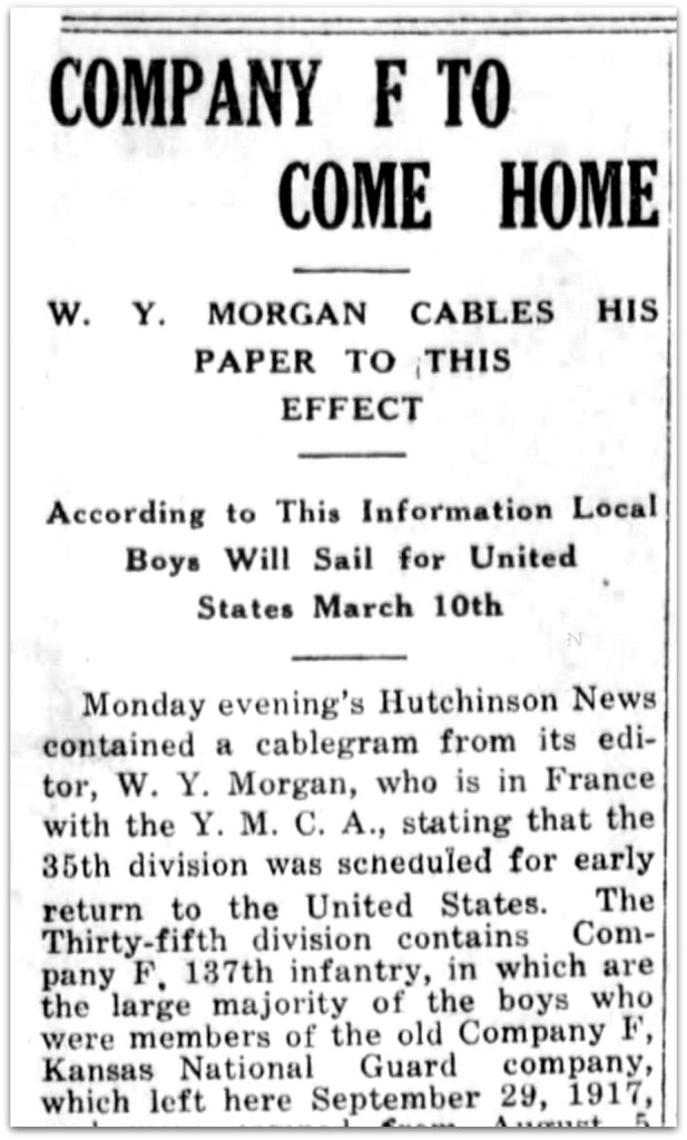 After a few days at Hoboken, the regiment took trains for Camp Funston, Kansas. They stopped in Topeka, Kansas on May 7 to parade down the main street. The All-Kansas regiment was back in Kansas.