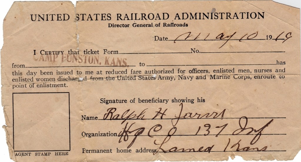 Ralph and others received their discharge papers at Camp Funston on May 9 and 10.