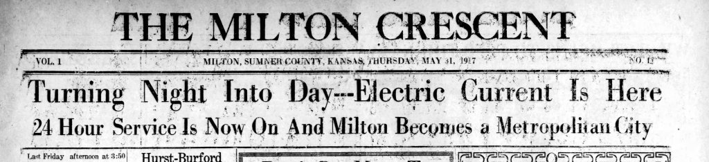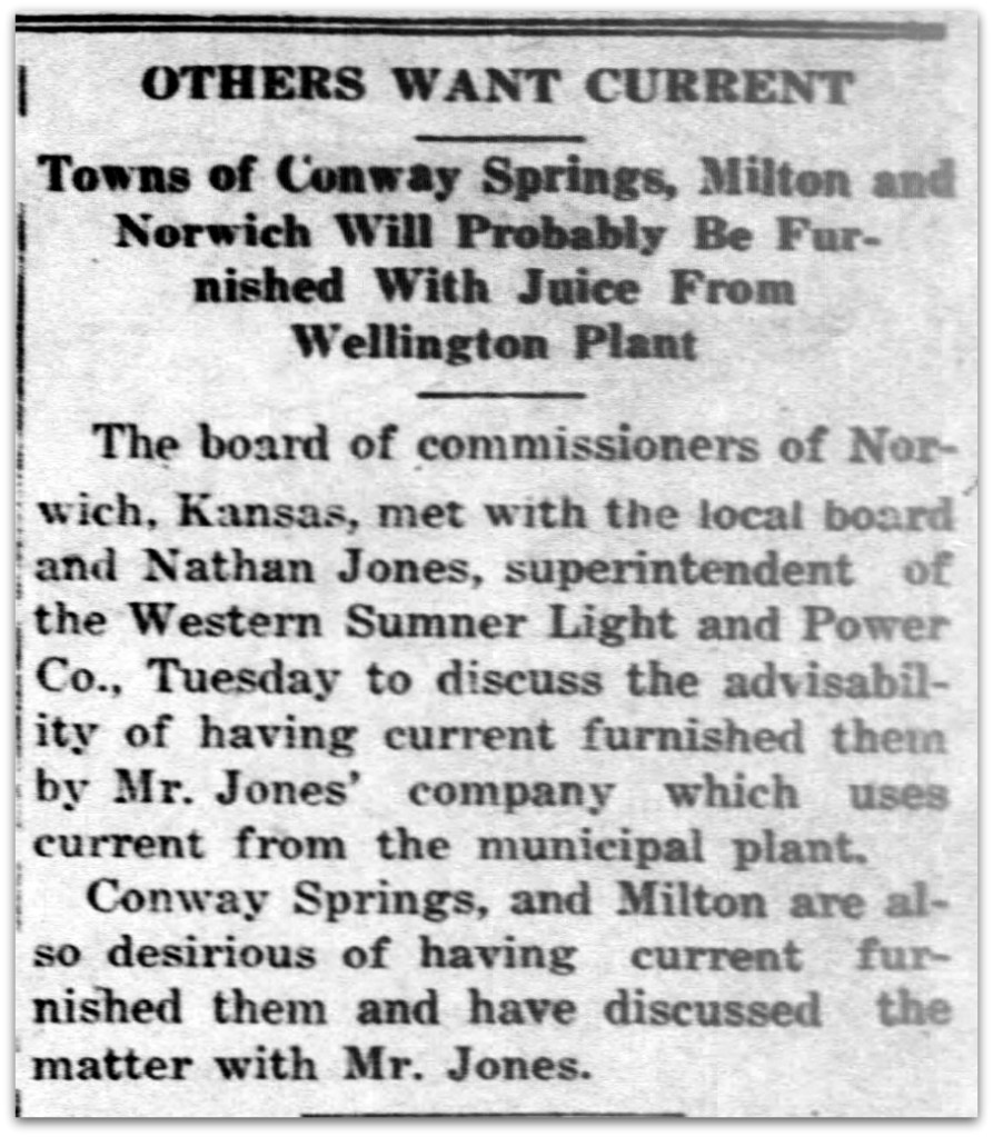 Argonia, Milan, and Mayfield, Kansas lit up their electric lights in May 1916. Now, in September 1916, Conway Springs and Milton and Norwich want Nathan Jones to provide electricity to their towns.