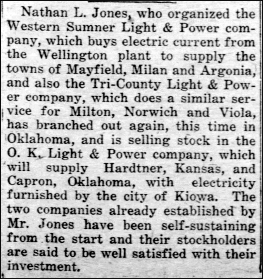 In August 1917, Nathan Jones established his third company, O.K. Light and Power Company to supply electricity to Capron, Oklahoma and Hardtner, Kansas. This company would buy electricity from the Kiowa, Kansas electric plant.