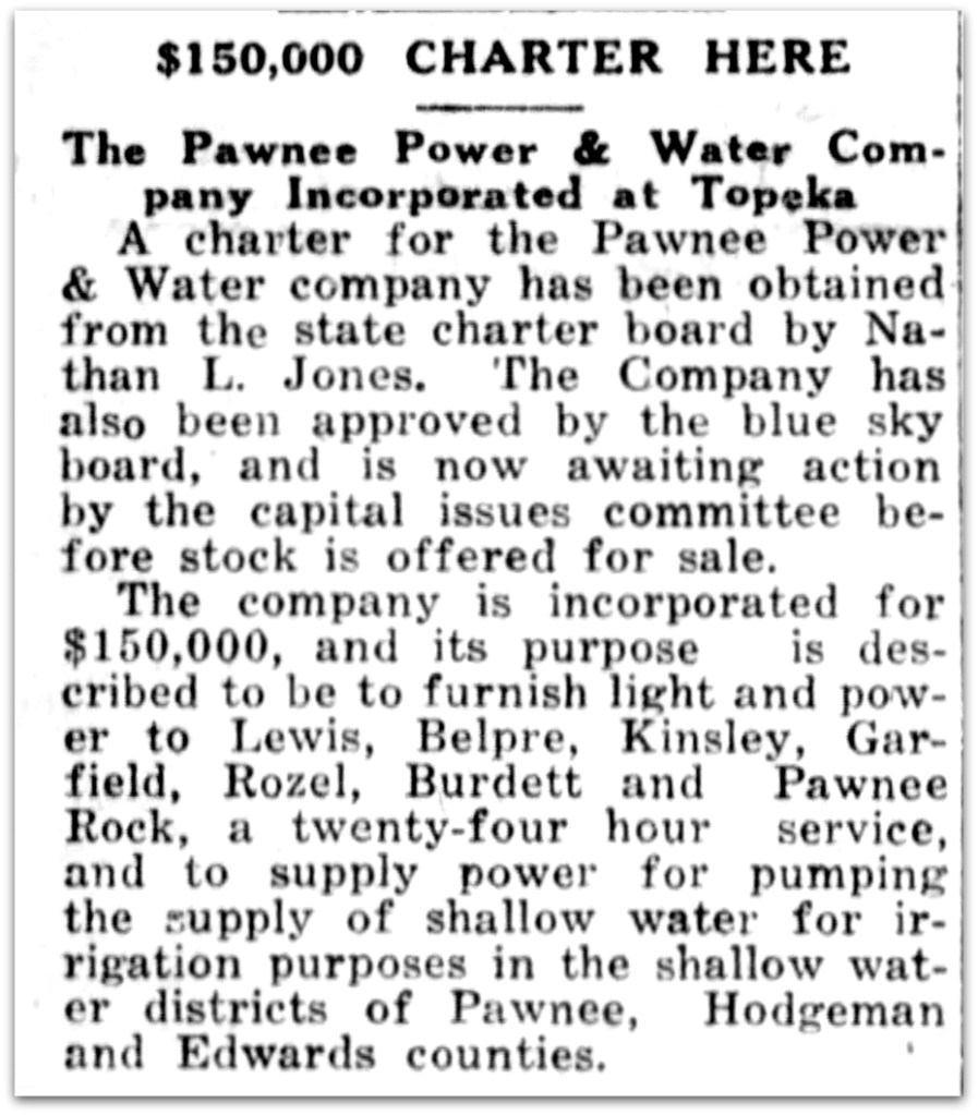 In December 1918, Jones got a charter from the state of Kansas to organize the Pawnee Power and Water Company.