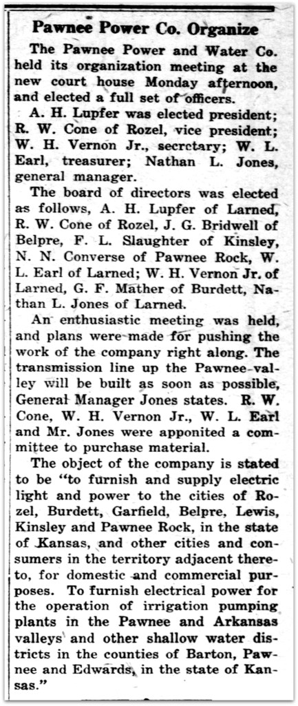 On April 17, 1919, the Pawnee Power and Water Company held its organizational meeting.
