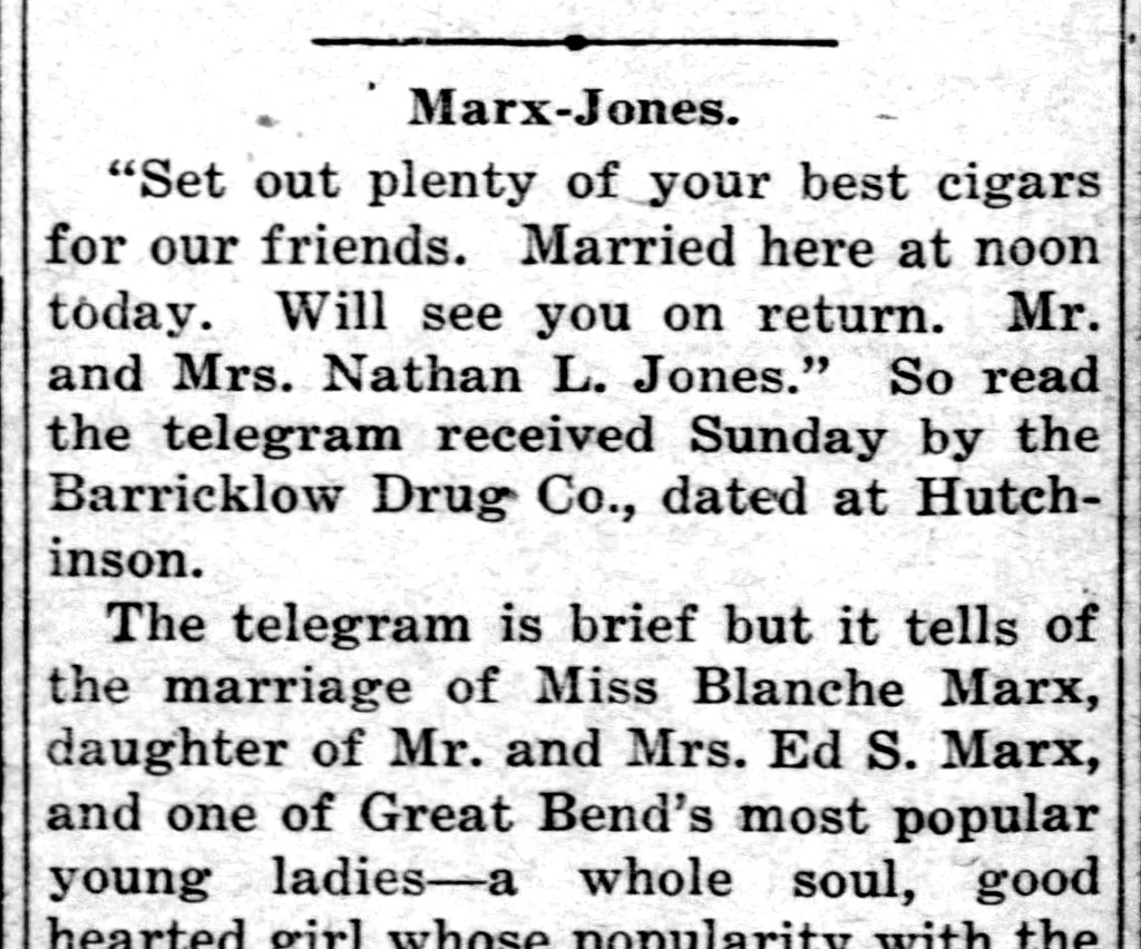 Nathan Jones and Blanche Marx married August 22, 1920, in Hutchinson, Kansas.