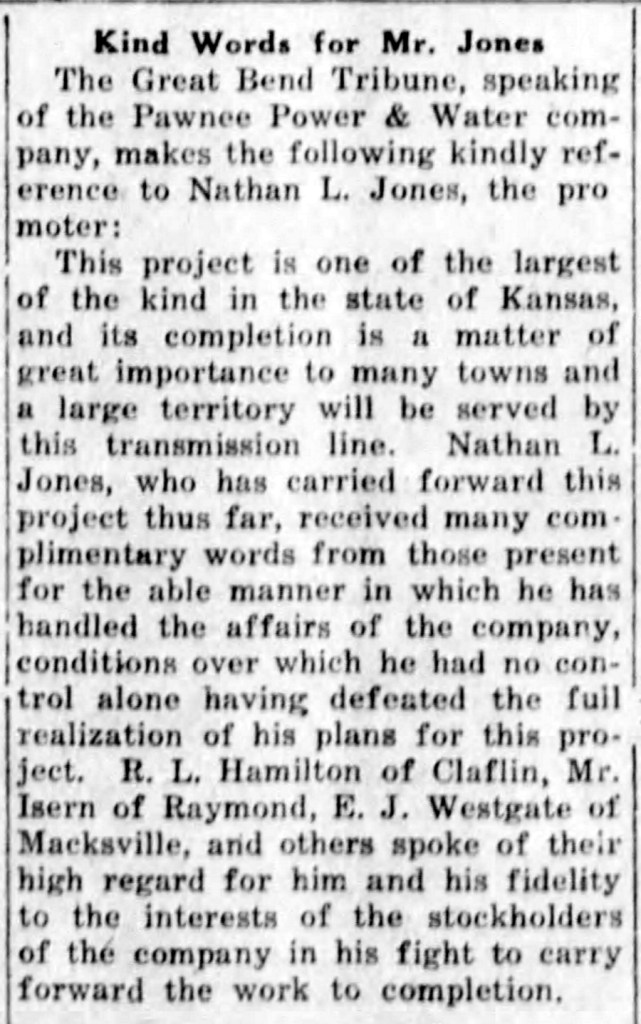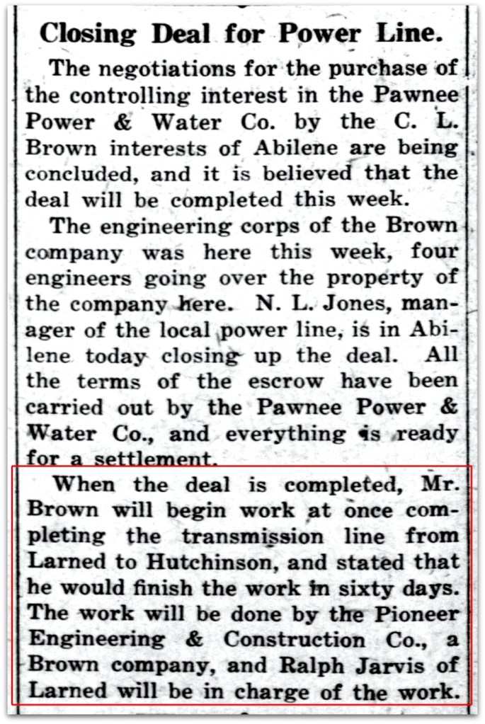 But the 65 mile line from Hutchinson through Lyons to Larned required a big investment. Jones sold and promoted, but the capital was slow to come. The loop couldn’t be “turned on” until this critical part was finished. And supplies and power poles and wire were in short supply. Electrical transmission was booming across the US, and materials were hard to get.