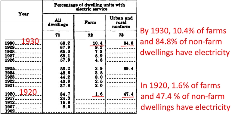 - Table – Electricity Use in Dwellings – 1920-1930 – Historical statistics of the United States, Colonial Times to 1957 – Federal Power Commission – https://www2.census.gov/library/publications/1960/compendia/hist_stats_colonial-1957/hist_stats_colonial-1957-chS.pdf