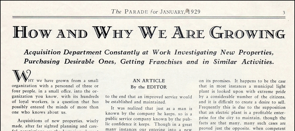 Continue readingIn 1928 and 1929, Public Utility Investment Company continued to thrive, growing even faster than before. Acquisitions increased several hundred percent during these two years.