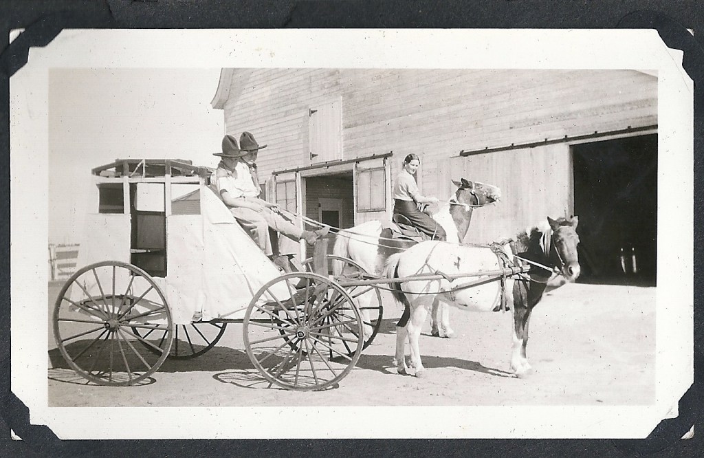 Don and Mel on stagecoach with Chief, unknown woman on Sandy – c 1930