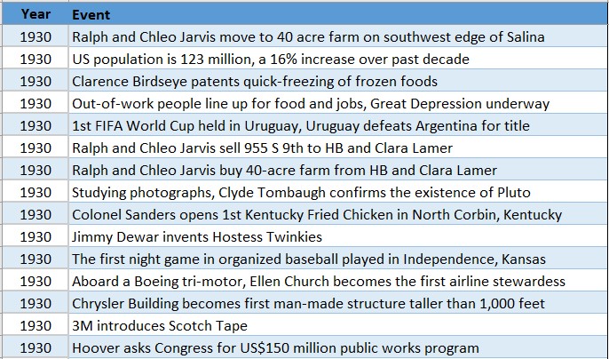 In December 1930, a month after they returned from their trip to Longview, Ralph and Chleo Jarvis bought a farm on the southwest edge of Salina.