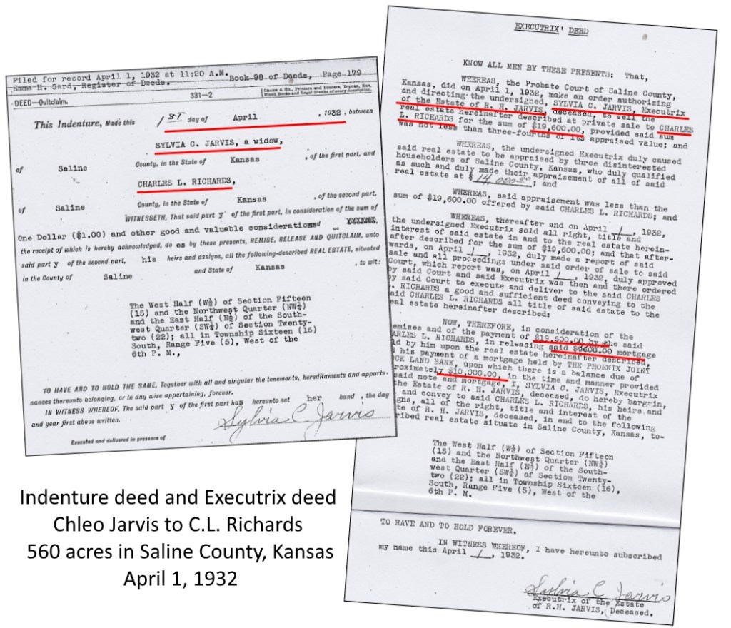 - Deeds – Chleo Jarvis to C.L. Richards – 1932 – Saline County Register of Deeds – Salina, Kansas