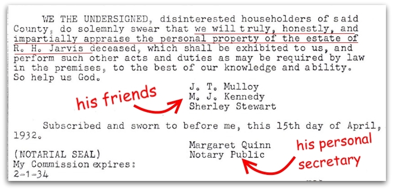 On February 24, the attorneys placed the required notice in the Salina Journal. Ralph’s friends and co-workers Jim Mulloy, Sherley Stewart, and M.J. Kennedy were appointed to inventory the value of his estate. Ralph’s personal secretary Margaret Quinn notarized the document.