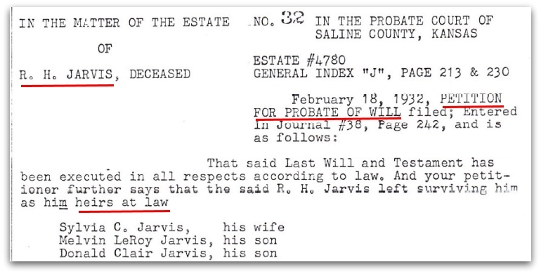 - Probate – Ralph Jarvis – Smoky Valley Genealogical Society – Salina, Kansas