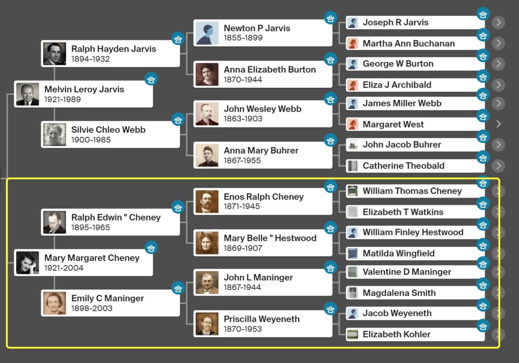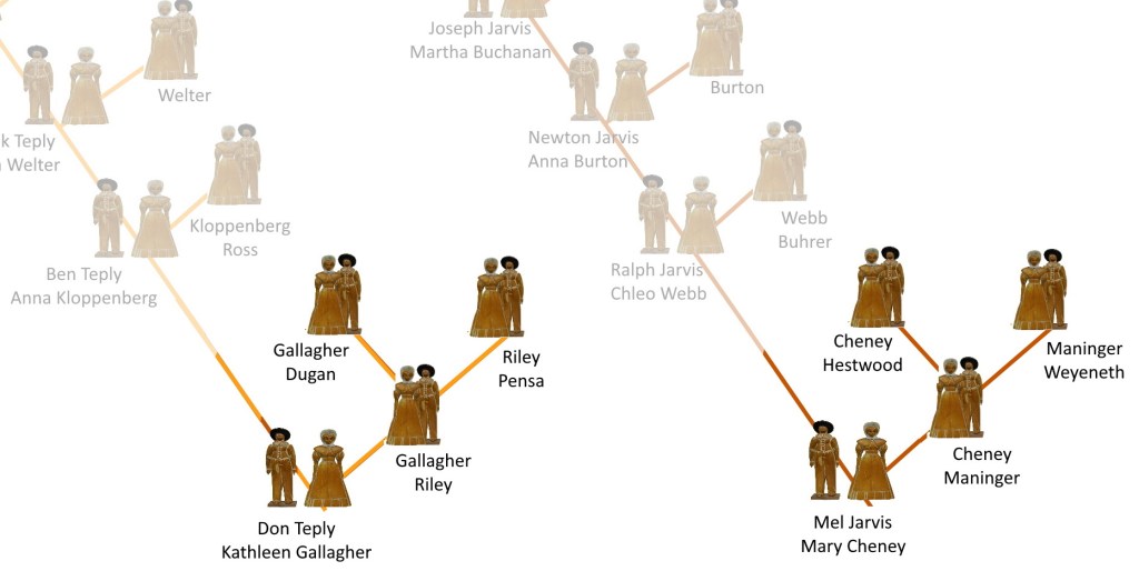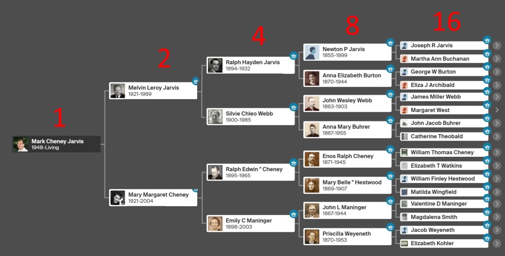 In each generation, our Jarvis and Teply male ancestor had a spouse. Each spousal line has its own ancestor branches. That’s how The Power of 2 results in so many grandparents.
