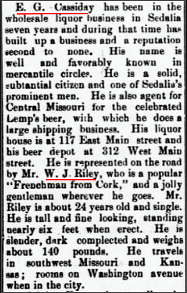 Will Riley had been working as a salesman for E.G. Cassidy beer and liquor distributorship since 1882. Cassidy had married Will’s older sister Kate Riley in 1881, and Cassidy was a mentor to Will.