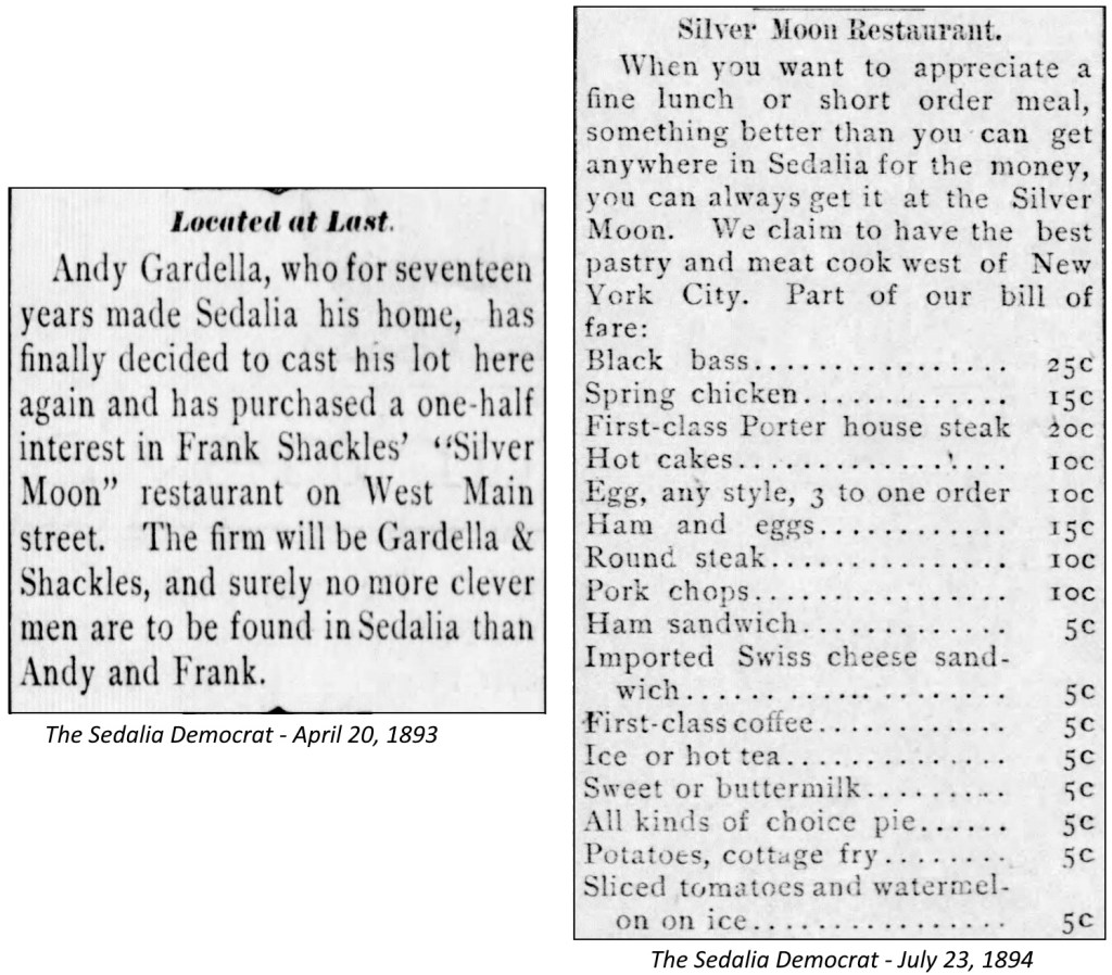 In 1893, Andy and Kate Pensa Gardella bought into the Silver Moon Restaurant in Sedalia.