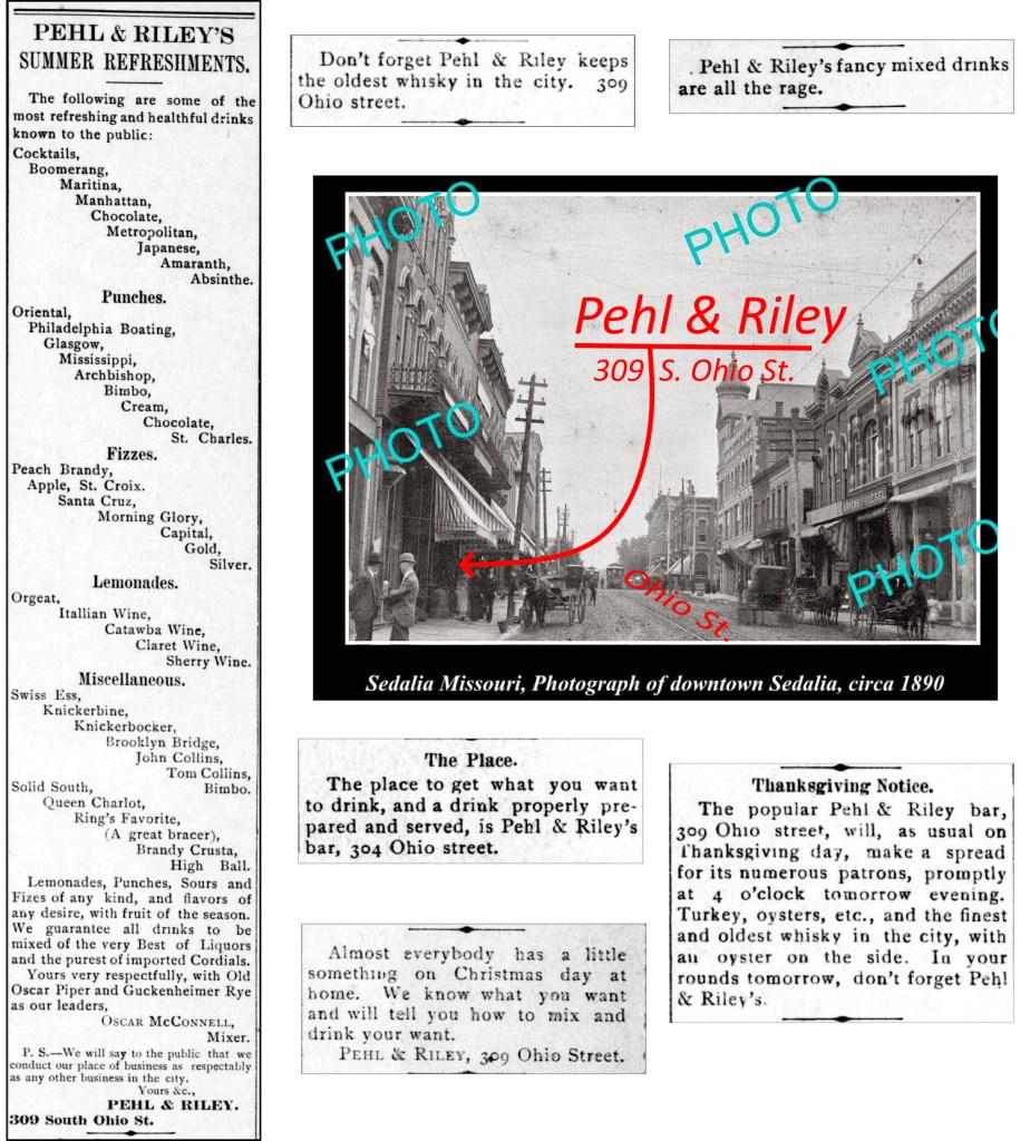 - News articles – Ads for Pehl & Riley – The Sedalia Democrat – various dates in 1890s – newspapers.com