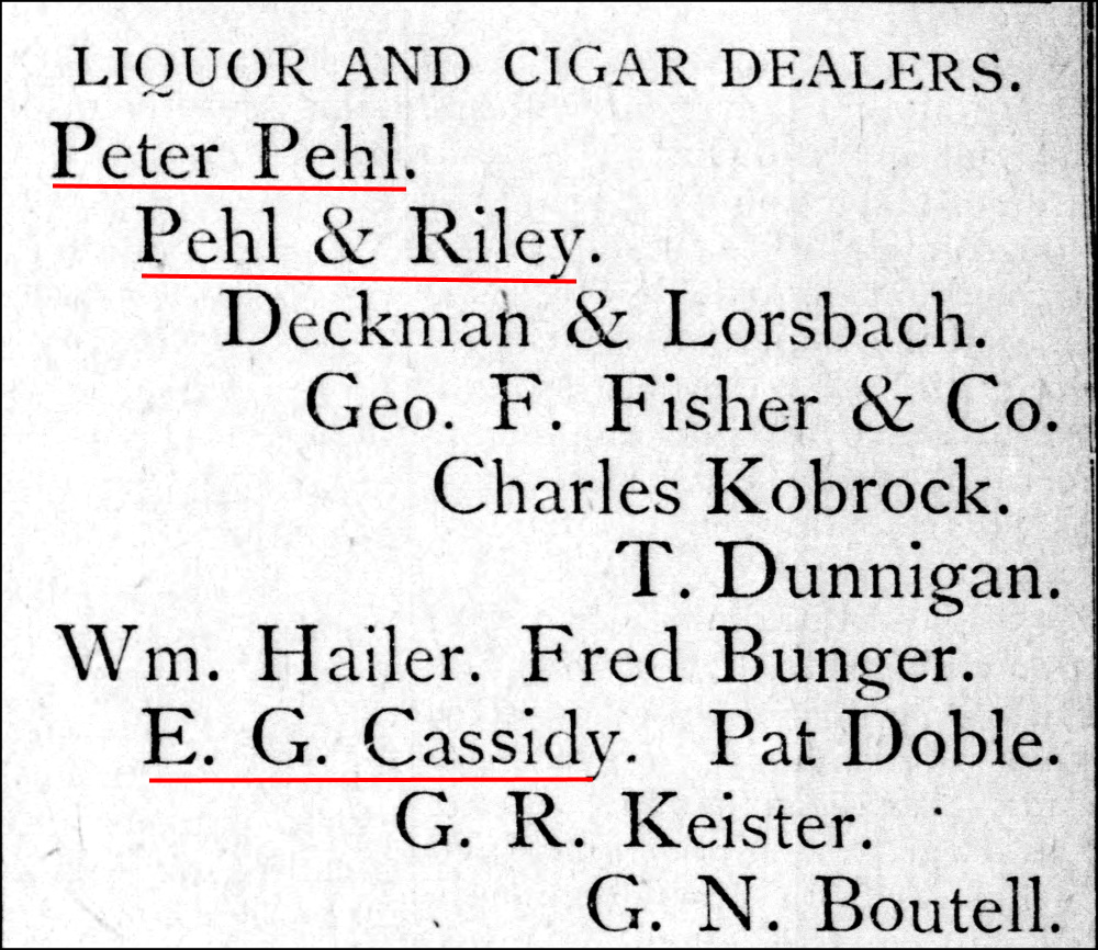 E.G. Cassidy opened a saloon in the early 1890s. A few years later, Will Riley would partner with Peter Pehl to open Pehl & Riley Bar, while Pehl kept his interest in another establishment, Pehl’s Bar. Cassidy, Pehl, and Riley had 3 of the 12 drinking establishments in town.