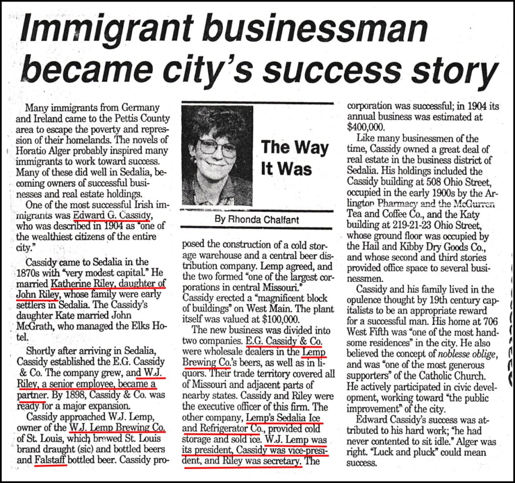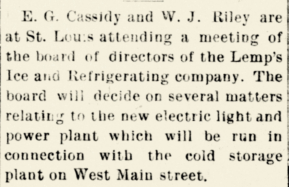 In 1898, Ed Cassidy and Will Riley made a pitch to William Lemp to build a distribution warehouse in Sedalia. It would be refrigerated, so it could host an ice business too. And it would generate electricity, perhaps selling electricity to Sedalia residents.