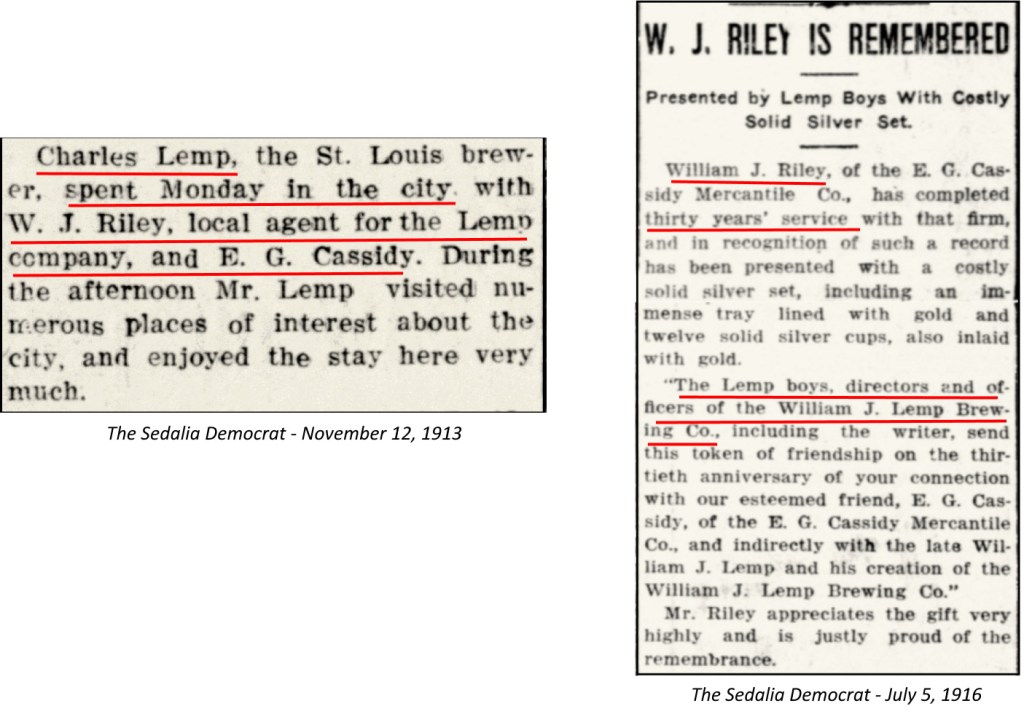 Ed Cassidy and Will Riley represented Lemp Brewing for 37 years, from 1882 until Prohibition in 1919.