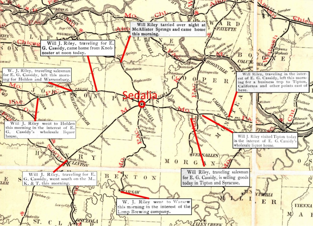 - News articles – Will Riley’s sales trips – The Sedalia Democrat – various dates during 1890s