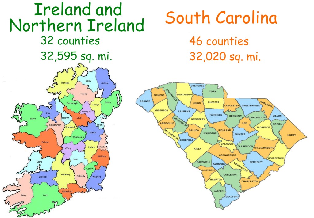 Ireland is similar in size to South Carolina. The population today is about 7 million, compared to South Carolina’s population of 5 million.