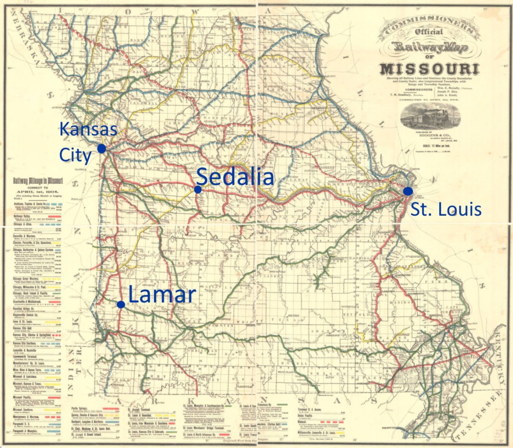 - Map – Commissioners official railway map of Missouri – State Historical Society of Missouri – https://digital.shsmo.org/digital/collection/Maps/id/150/rec/103