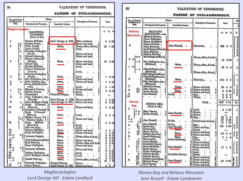 In Griffith’s Valuation of 1857, all the Gallagher and Roarty and other families are tenants of either Lord George Hill, Francis Forster, or Jane Russell.