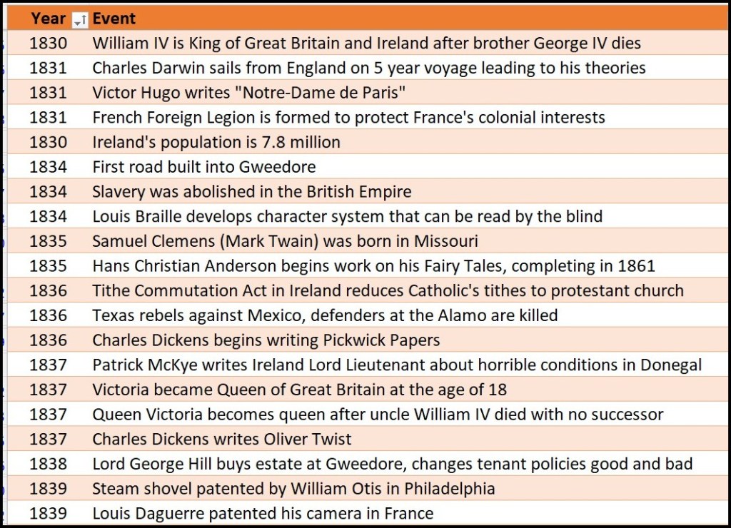 In 1837, Lord Lombardy, the Lord Lieutenant of Ireland came to Dunlewey House. There, schoolmaster Paddy McKye presented Lord Lombardy with a letter describing the awful conditions of the local residents. Here are some excerpts: