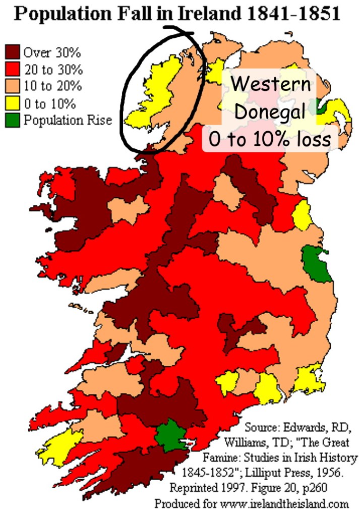 Surprisingly, western Donegal didn’t experience the drastic population loss like some other areas. Do Lord George Hill and Francis Forster and Jane Russell deserve any credit for this? Perhaps so.
