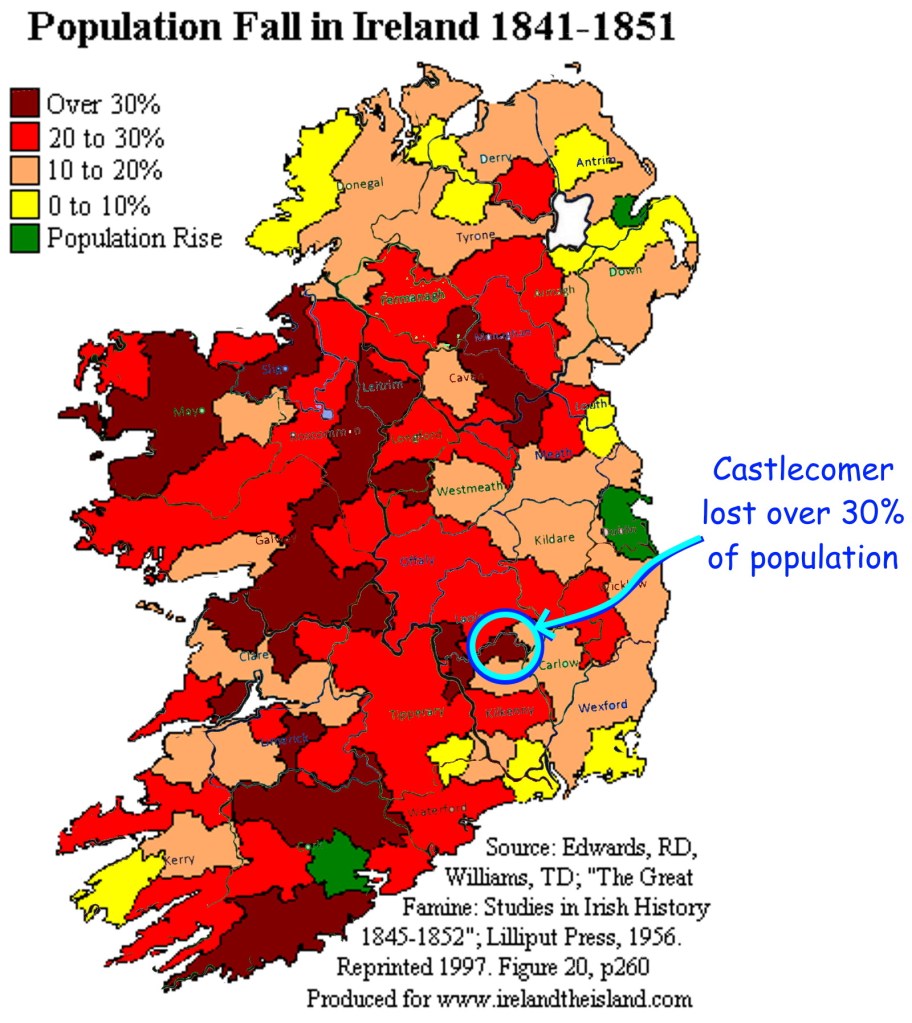 Wandesforde’s policies changed Castlecomer dramatically. From 1830 to 1841, and continuing through the Great Famine to 1851, the population dropped over 30%.