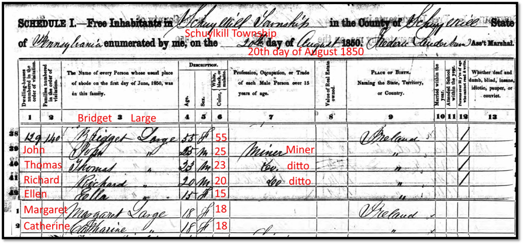 John, 25, Thomas, 23, and Richard Large, 20, worked as miners. Eldest son William wasn’t living in Bridget’s household. He had married Ellen Brennan and they lived in a separate household.