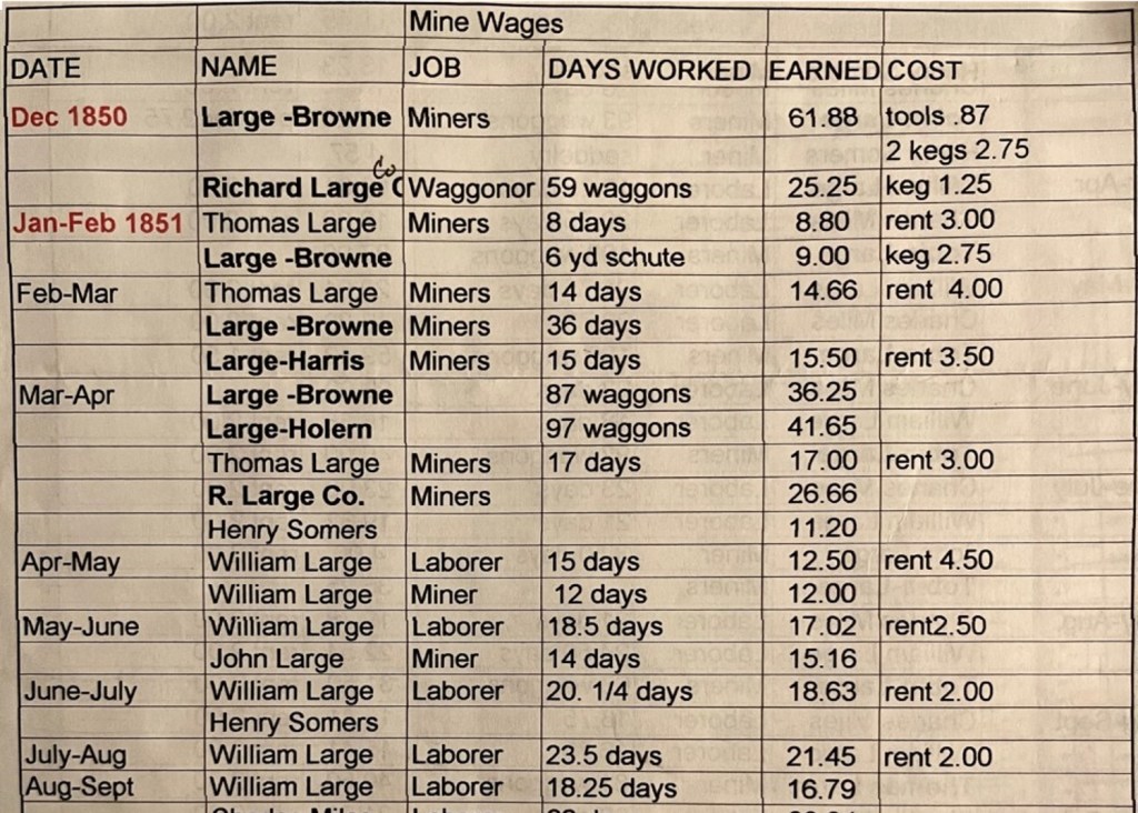We are lucky to have some mine work records for the Large brothers. One of Thomas Large’s descendants, now deceased, compiled these records and gave a copy to Deb Large Fox. Unfortunately, we don’t know which mine the records are from.